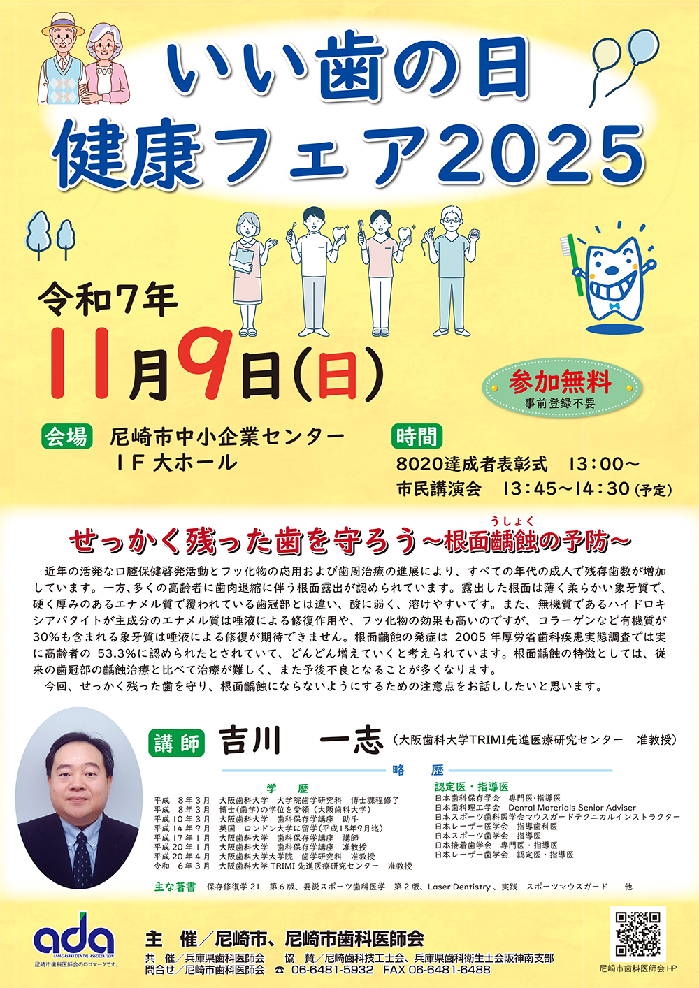 日時:令和7年11月9日(日) ・8020達成者表彰式 13:00~ ・市民講演会 13:45~14:30(予定) 会場:尼崎市中小企業センター1F 大ホール 《参加無料・事前登録不要》